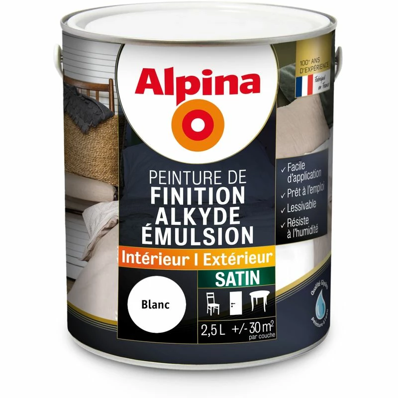 Alpina Peinture Alkyde En Emulsion Bois & Multisupports – Intérieur & Extérieur – Satin – 2,5L | Finition: Satinée – Couleur: Blanc – Blanc